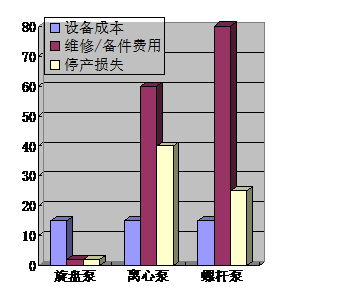從購買成本、維修、人力、配件、產(chǎn)品質(zhì)量改變和產(chǎn)量各方面進(jìn)行綜合比較得出的直方圖,可以發(fā)現(xiàn)管沿泵是最出色的。
